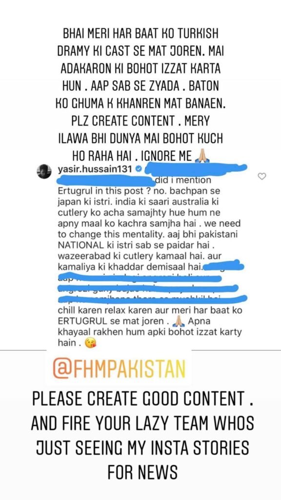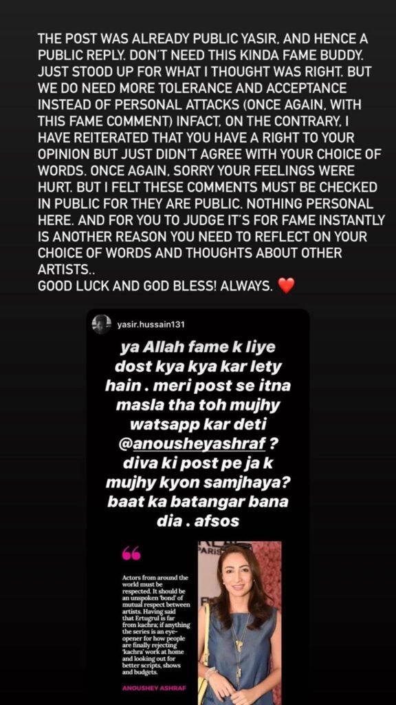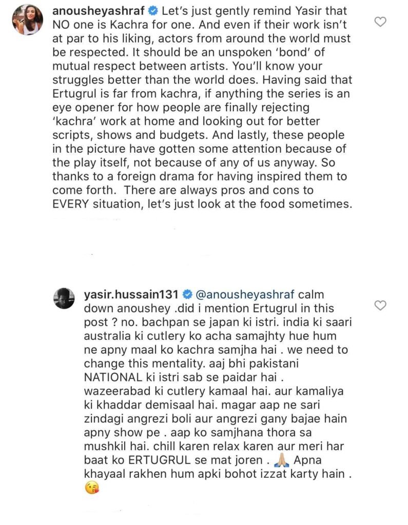 Later, while commenting under a social media post which discussed Yasir’s denial of calling Turkish actors ‘kachra‘ and his request to Anoushey to not connect every statement of his to Diriliş: Ertuğrul, Anoushey posted a long comment in which she hit out at her colleague and advised him to “Just better yourself and be the best ambassador you can be for Pakistan in your capacity.”