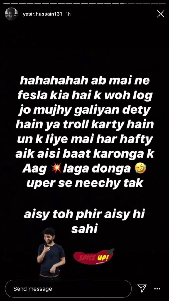 While Yasir did not respond to Anoushey’s latest comments, he posted this image on his Instagram story Tuesday afternoon.