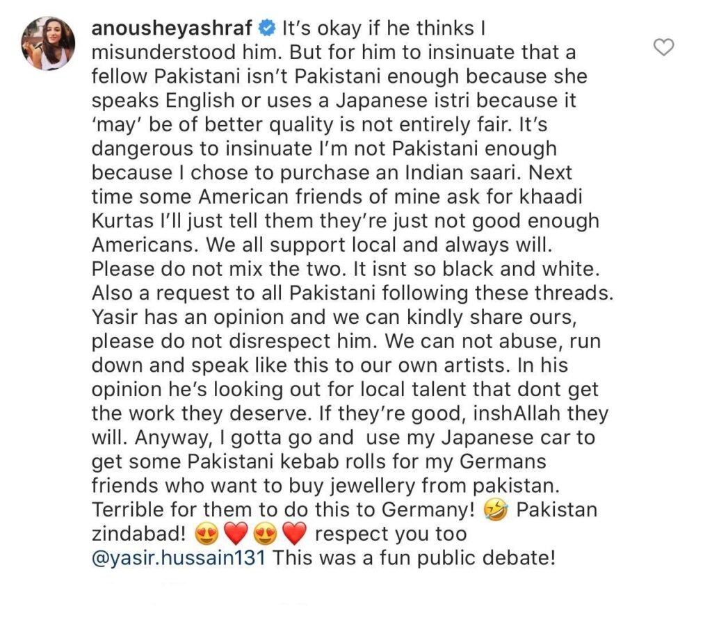 Anoushey had responded to Yasir’s comments by saying that “It’s dangerous to insinuate I’m not Pakistani enough because I chose to purchase an Indian saari.”