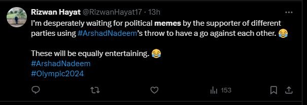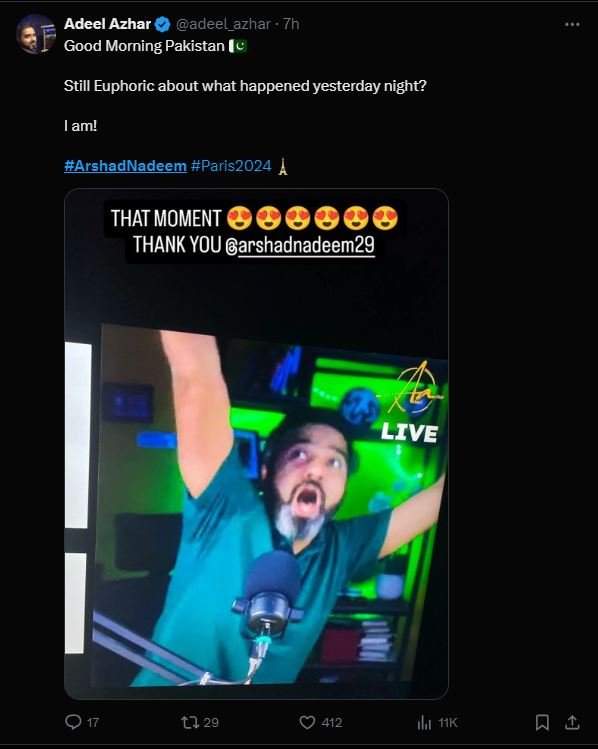 At the opening ceremony of the Olympics on July 26 in Paris, Nadeem carried the Pakistan flag along with swimmer Jehanara Nabi.