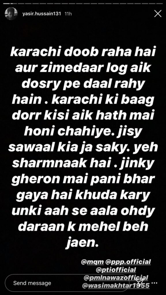Meanwhile, other celebrities including Humayun Saeed, Wasim Akram, Shaniera Akram, Farhan Saeed, Ali Rehman Khan, Ali Zafar, Bilal Ashraf, Hira Mani and Maya Ali sent prayers for the city and those affected by the catastrophic rains.