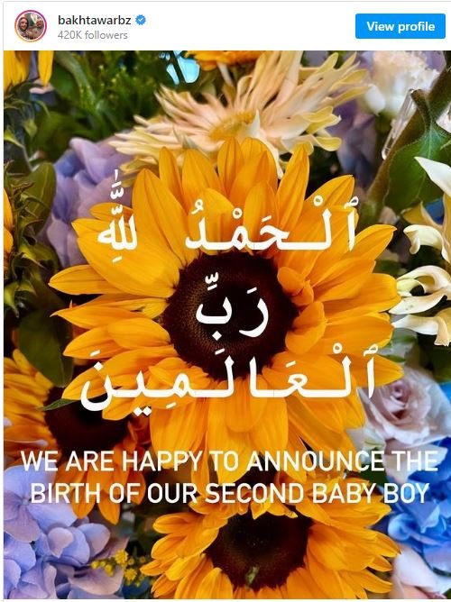 Bakhtawar posted, the news with caption, ” We are happy to announce the birth of our second baby boy.”
