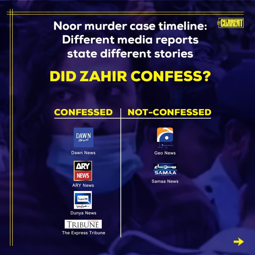 The accused made the confession during interrogation but has not given a reason for murdering Noor. Dawn, The Express Tribune, ARY News, Dunya have reported that Zahir Jaffer, the prime suspect in the murder of Noor, confessed to killing her before the investigators during his interrogation. Sources said the prime suspect has repeatedly changed his reasoning for committing the brutal crime.