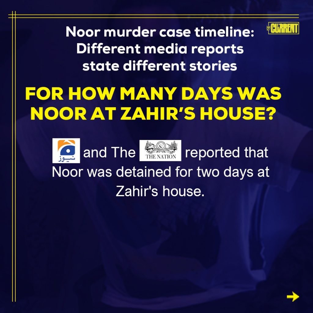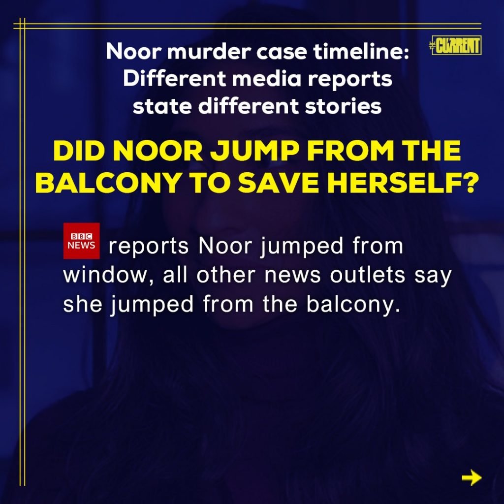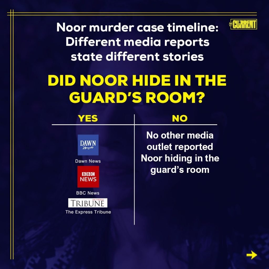 BBC Urdu, Dawn, and The Express Tribune added that Noor hid in the guard’s room after finding the gate locked, adding that later the accused broke into the room and dragged her back into the house.