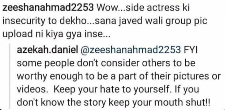 A netizen commented under the post that she deliberately sidelined Sana from the pictures, the Pari actor was quick to reply with an elaborative note. She mentioned that it is actually the Pyaray Afzal diva who refused to feature in the pictures with her as she doesn’t find her co-star ‘worthy’ enough to pose with.
