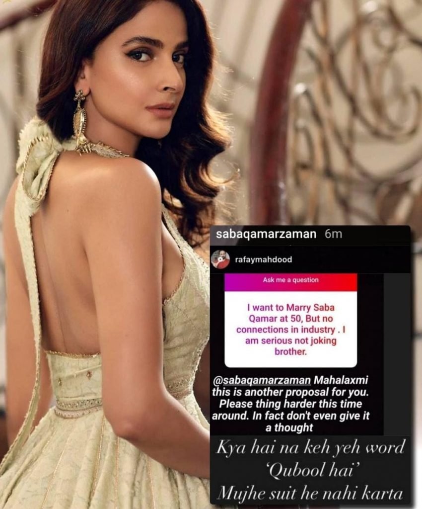 “I want to marry Saba Qamar at 50, But no connections in industry. I am serious not joking brother,” wrote a fan on influencer Rafay Mahdood’s Instagram Q&A stories.