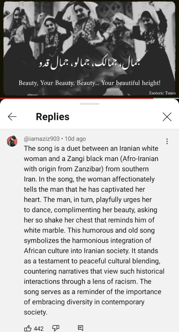 I was searching for the meaning of the song and came across the comment of a YouTube user which said that the song is a duet between an “Iranian white woman and a Zangi black man (Afro-Iranian with origin from Zanzibar) from southern Iran.”