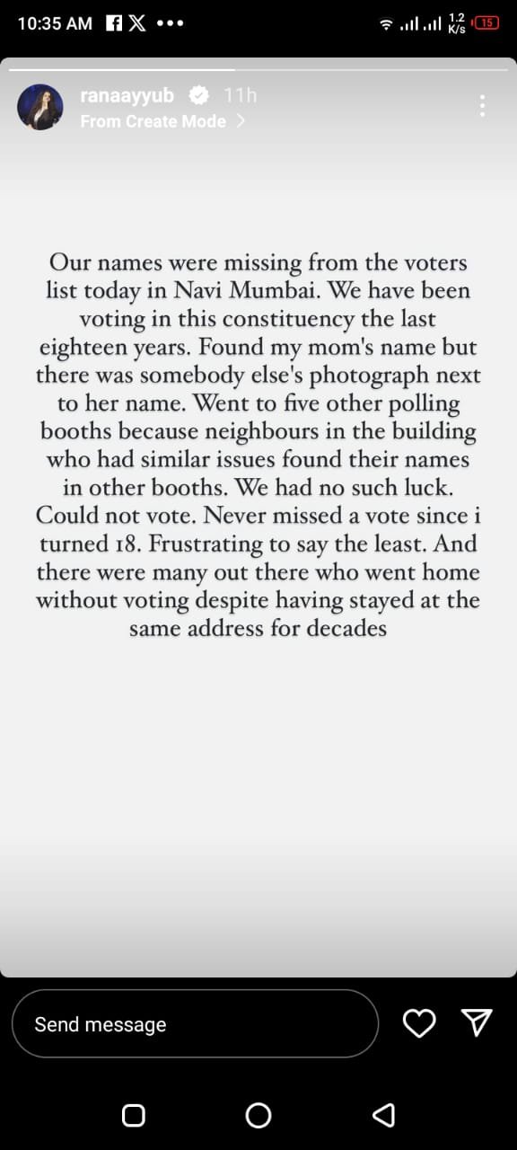 Journalist Rana Ayyub, who is also vocal about intolerance in India towards Muslim community, posted an Instagram story stating that she went with her family to vote and their names were missing from the voters list in Nayi Mumbai area despite the fact that they have been voting in this constituency for the last eighteen years. “Never missed a vote since I turned 18. Frustrating to say the least.”