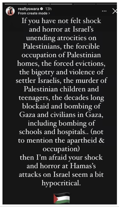 Actress Swara Bhasker also condemned the brutal attack on Palestinian civilians by Israeli terrorists, and released a statement on her Instagram stories calling out the hypocrisy of those who were “shocked” by the violence of the Hamas.
