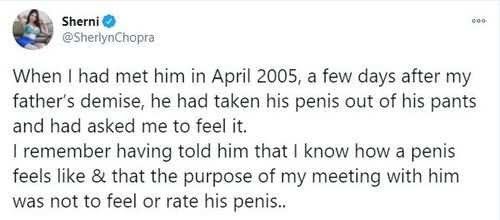 Recounting an incident that took place back in 2005, the Indian actress wrote, “When I had met him in April 2005, a few days after my father’s demise, he had taken his penis out of his pants and had asked me to feel it. I remember having told him that I know how a penis feels like and that the purpose of my meeting with him was not to feel or rate his penis.”