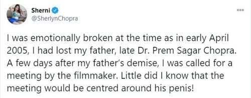 She further said: “I was emotionally broken at the time as in early April 2005, I had lost my father, late Dr Prem Sagar Chopra. A few days after my father’s demise, I was called for a meeting by the filmmaker. Little did I know that the meeting would be centred around his penis!”