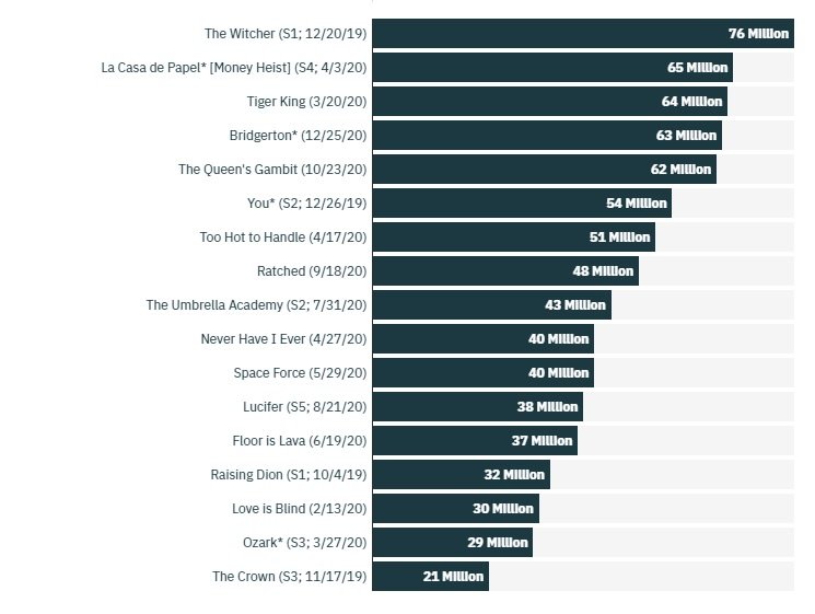 Topping the list is The Witcher, which was watched by 76 million households in its first four weeks, as announced by Netflix in January 2020. Starring Henry Cavill, the series explores the legend of Geralt of Rivia and Princess Ciri, who are linked to each other by destiny.