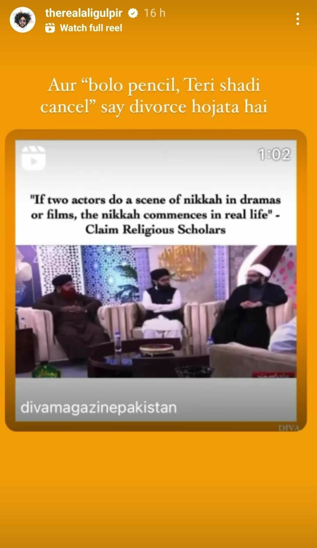 Rapper and comedian Ali Gul Pir shared the video on his Instagram stories to make fun of the situation. He joked, “And you can get divorced by saying ‘Say pencil, your wedding’s cancelled’.”