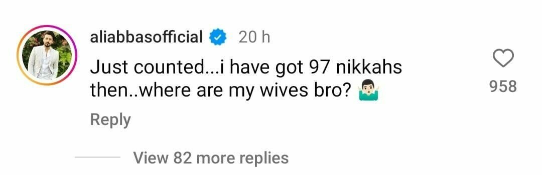 But amidst the confusion, there’s one group of people who are having a field day with this news – single actors! They’re joyfully tallying up their on-screen spouses, with some even joking about having more marriages than they can count. “Just counted… I have got 97 nikkahs then. Where are my wives, bro?” actor Ali Abbas asked in the comments section