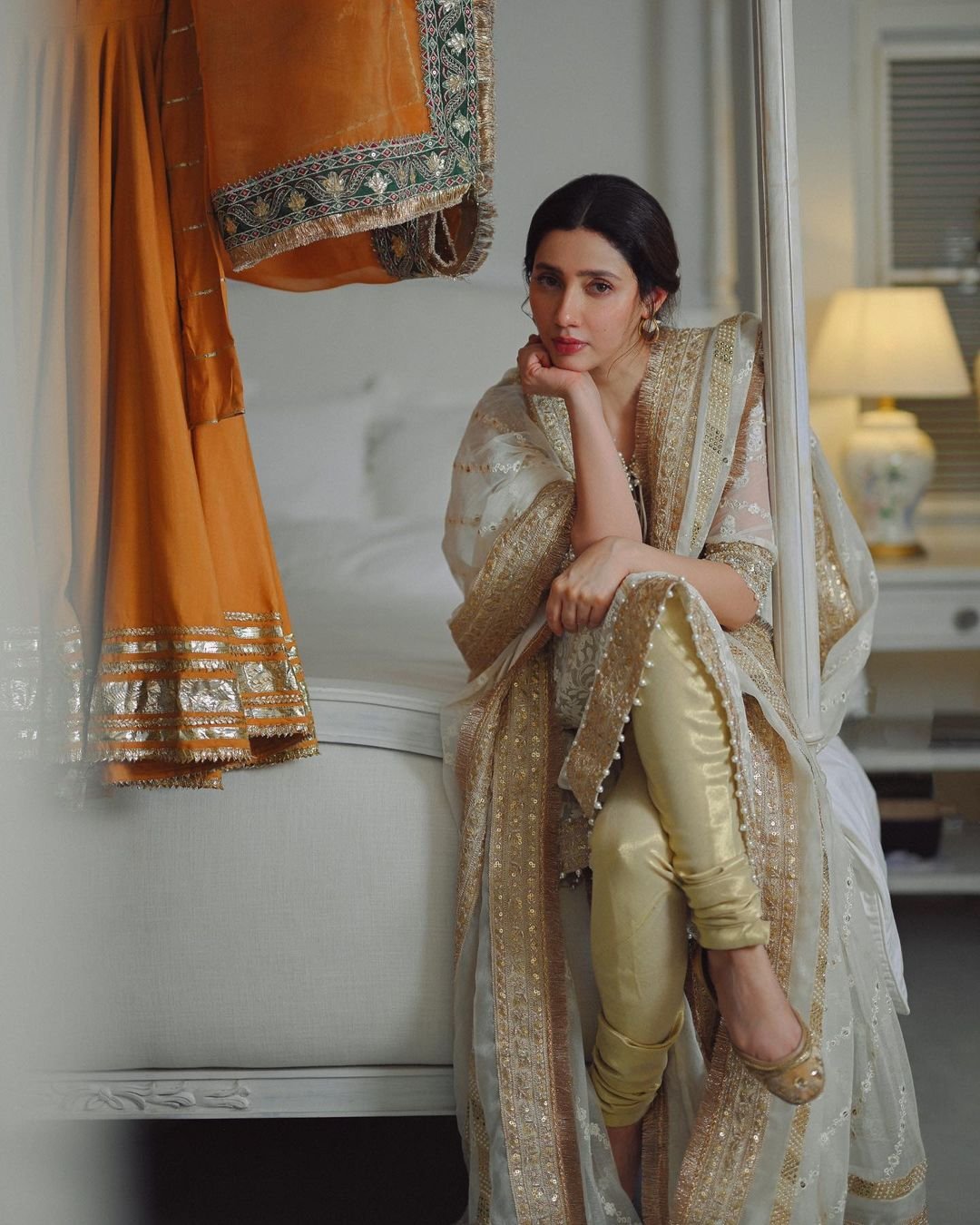 Talk your talk, whatever, but we’re ready to die on this hill because Mahira proves you don’t need flashy photography, cakey makeup and an emerald encrusted jora to look like the belle of the ball. She looks picturesque in this elegant yellow sari made by Khadija Shah. Also with her hair in a pigtail and her glowing face, this is going to be the look women will sought to recreate for their weddings.