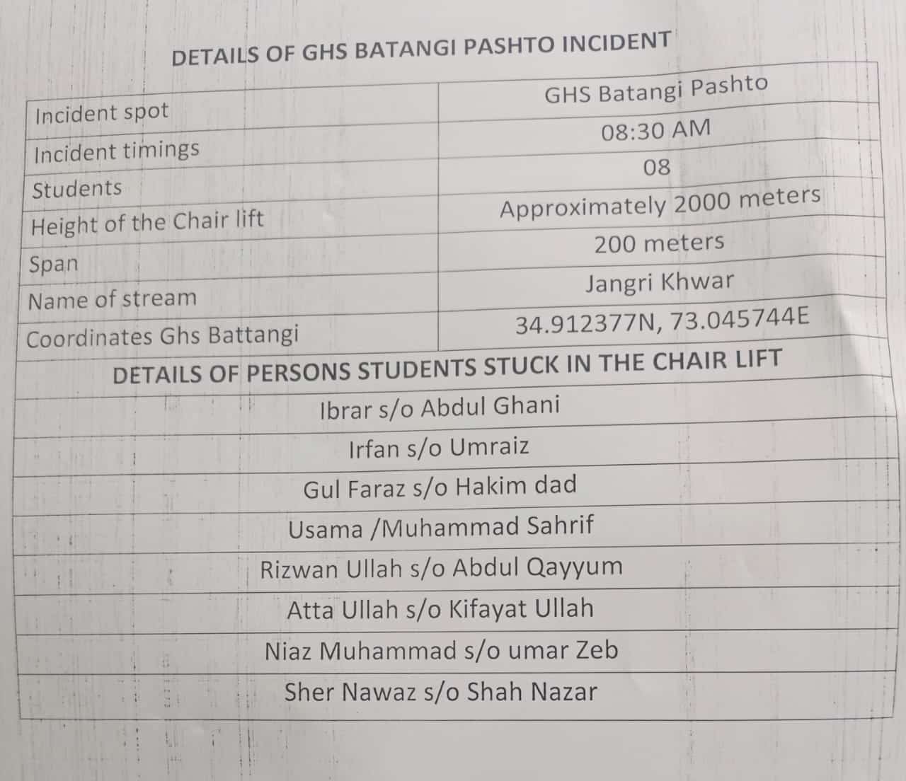 The students present in the cable car were Ibrar (son of Abdul Ghani), Irfan (son of Umraiz), Usama (Muhammad Sharif), Rizwan Ullah (son of Abdul Qayyum), Atta Ullah (son of Kifayat Ullah), Niaz Muhammad (Umar Zeb), and Sher Nawaz (son of Shah Nazar).