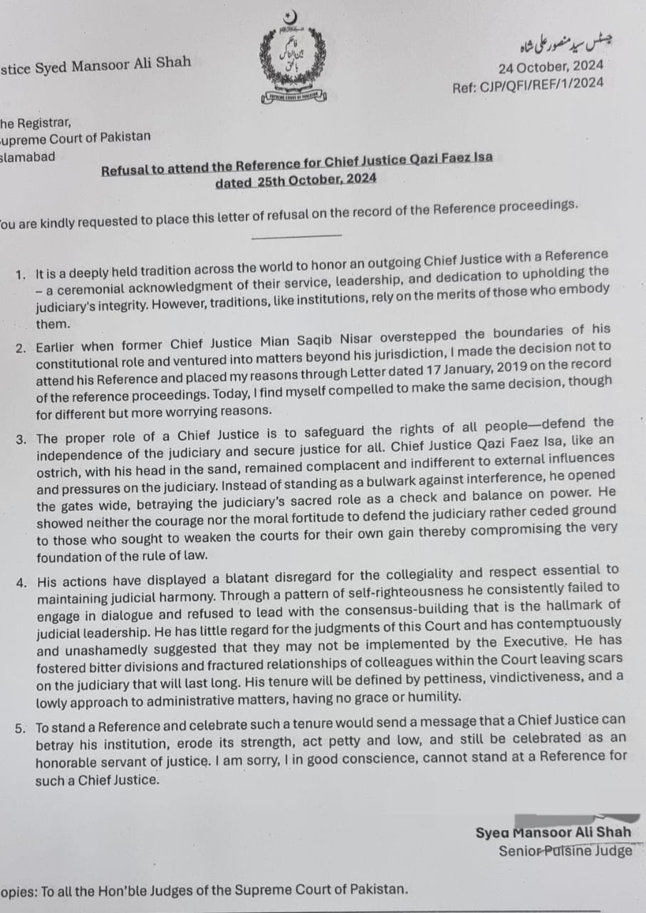 The senior puisne judge Syed Mansoor Ali Shah, in a letter of refusal on the record of the reference proceedings, alleged that CJP Isa had not upheld the integrity of the judiciary during his tenure.