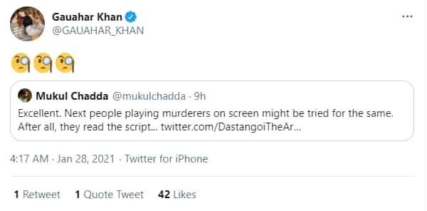 Gauahar retweeted the tweet along with three ‘face with monocle’ emojis.