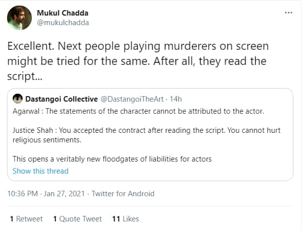 Responding to the bench’s comment, a Twitter user said: “Excellent. Next people playing murderers on screen might be tried for the same. After all, they read the script.”