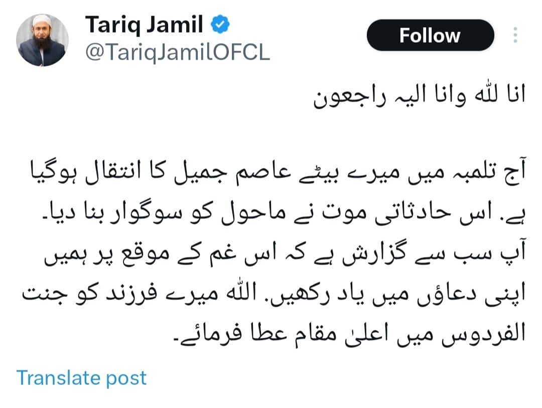 Maulana Tariq Jamil has himself taken to social media to say the death was “accidental”, while asking people to pray for his son’s soul.
