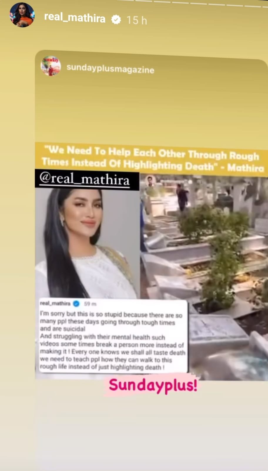 In an Instagram post, Mathira said, “I’m sorry but this is so stupid because there are so many people these days [who are] going through tough times, are suicidal and struggling with their mental health. Such videos sometimes break a person more than they make them. Everyone knows we shall all taste death. We need to teach people how they can walk through this rough life instead of just highlighting death.”