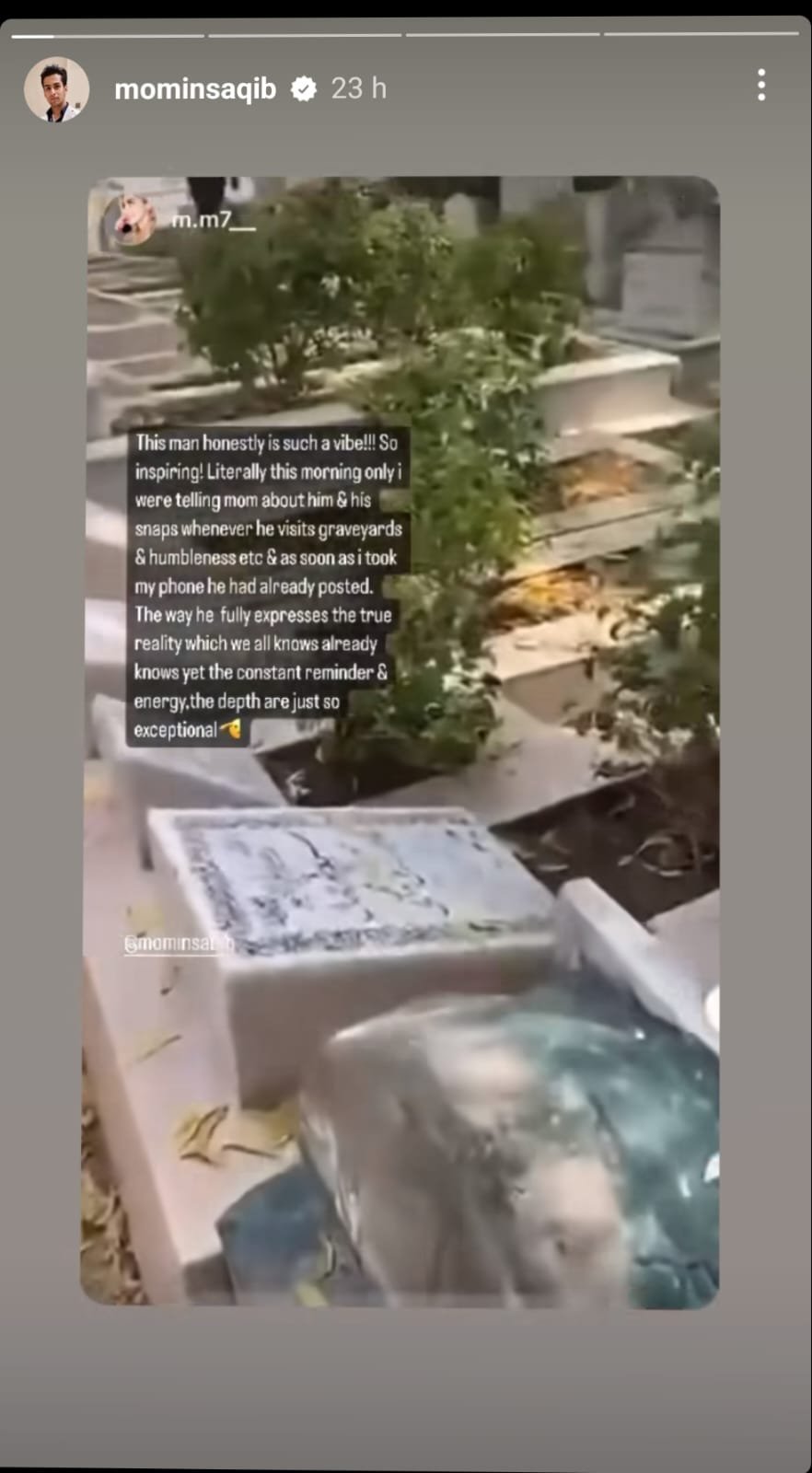 In Momin’s Instagram stories, he talked about death while walking through a graveyard. “This is tomorrow. This is the future. This is the only reality, the only certainty in life. This is the future for all of us,” he said. He goes on to add: “No matter what you do, how much money you make, how famous you get, this is the end. All your pride, any failure, any embarrassment in life, a moment of happiness, all of that will end when death comes.”