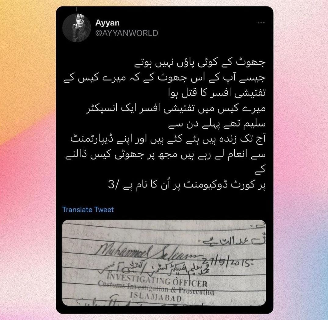 Supermodel Ayyan Ali took to her official Twitter handle to respond to former PM Imran Khan’s allegations about her case. Khan recently claimed that the custom officer in the supermodel’s case was killed to facilitate her.