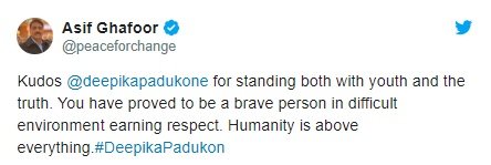 DG ISPR Major General Asif Ghafoor praised #DeepikaPadukone for being a brave person and “standing both with youth and the truth.”