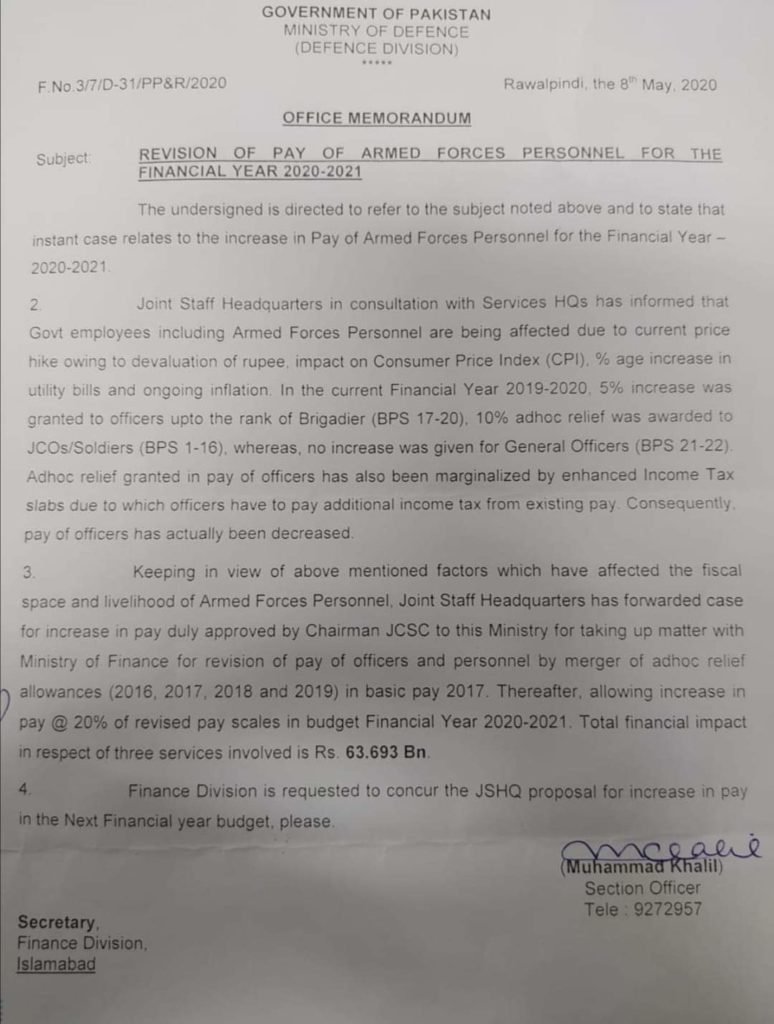 Keeping in view the above mentioned factors, which have affected the fiscal space and livelihood of the armed forces personnel, joint staff headquarters have forwarded a case for the increase in pay duely approved by the chairman joint chief of staff committee to the Defence Ministry for taking up the matter with the Finance Ministry for the revision of pay of armed forces personnel.