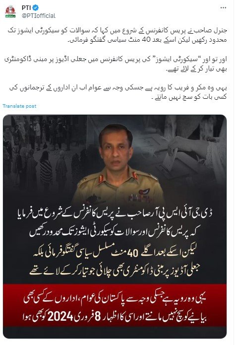 The top leadership of Pakistan Tehreek-e-Insaf (PTI) in a joint presser addressed the many thing pointed out by the Director General (DG) Inter-Services Intelligence (ISI), Lieutenant General Nadeem Anjum and DG of Inter-Services Public Relations (ISPR) DG Major General Babar Iftikhar in an unprecedented press conference which took place earlier today.