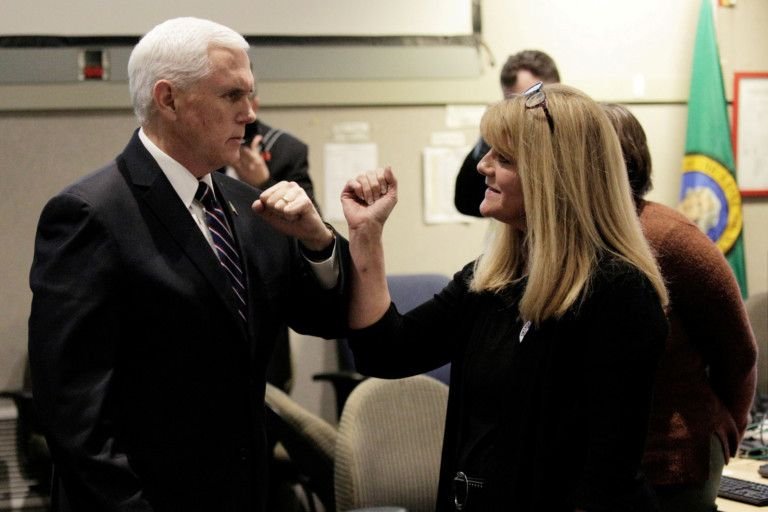 US Vice President Mike Pence, who heads the government’s coronavirus task force, greets a woman at the Washington State Emergency Operations Center during a tour.