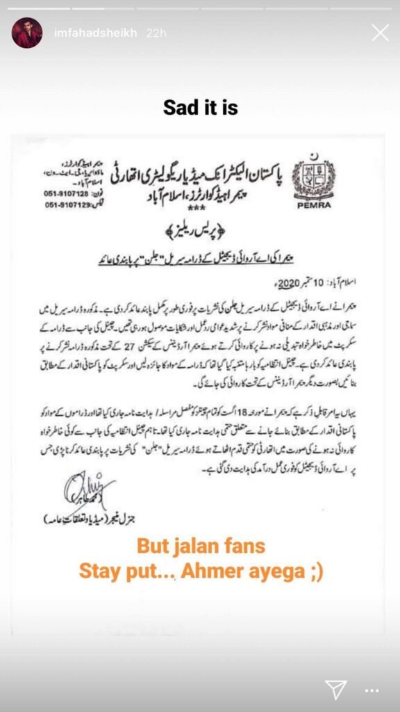 While the lead cast and makers of the drama have yet to respond to the ban, Fahad Sheikh who plays Ahmer in the drama, expressed his disappointment over the decision.