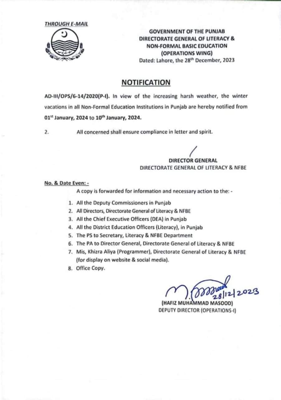 Despite the absence of an official decision or announcement from the School Education Department (SED) Punjab regarding an extension in the winter break, a notification issued by the Literacy & Non-Formal Education Department Punjab regarding the winter break for its non-formal educational institutions has started discussions.