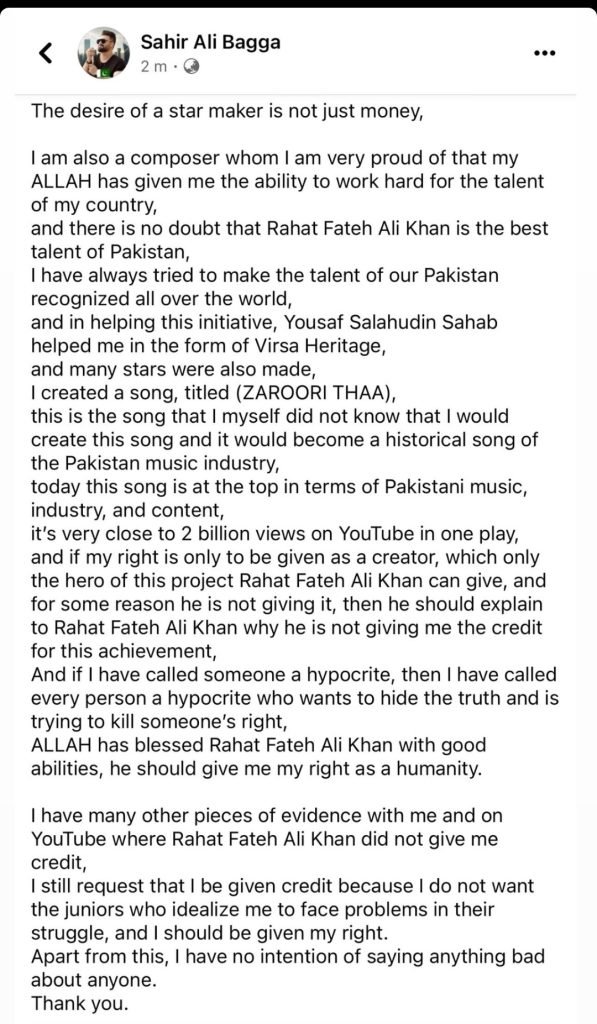 The ongoing dispute between Sahir Ali Bagga and Rahat Fateh Ali Khan has escalated to new heights. Bagga has now taken to Facebook to express his grievances, asking for proper credit as the composer of the popular song ‘Zaruri Tha’.
