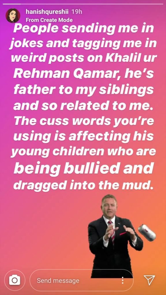 Playwright Khalil Ur Rehman Qamar’s stepdaughter Hanish Qureshi took to Instagram asking social media users to stop harassing her siblings over their father’s personal opinions.
