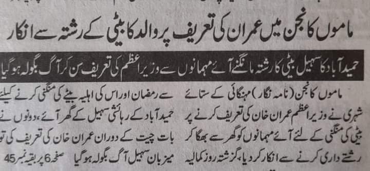 A man in Faisalabad rejected a marriage proposal for his daughter after the other side praised Prime Minister (PM) Imran Khan, an undated Urdu newspaper clipping claimed.