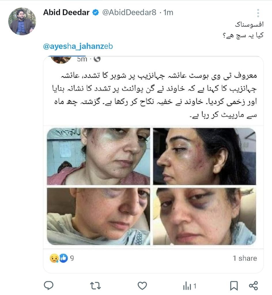 Television host Ayesha has accused her husband Haris Ali of domestic abuse. They are currently married and have two children together. On Tuesday, Ayesha went to the police station with a bruised face to file a report against Haris. Her daughter Zoha accompanied her. In an interview with Samaa TV, Ayesha revealed that this is the third time in six months that Haris has beaten her. The issues between the couple reportedly started after Haris’s secret marriage.
