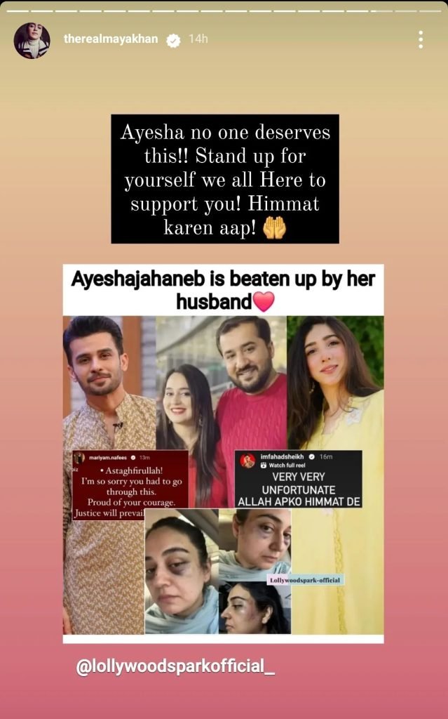 Many people, including celebrities and social media users, are showing their support for Ayesha, calling her brave for dealing with abuse and continuing her work. Prominent figures like Reham Khan, Hina Pervaiz Butt, and Sania Aashiq have expressed their strong support for her. The shocking images Ayesha shared on social media have also drawn widespread sympathy and support from the public.