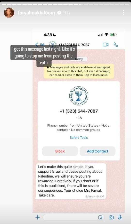 Social media influencer and wife to boxer Amir Khan, Faryal Makhdoom has used her social media platform to speak out on the Israeli bombardment of Palestine. She shared a screenshot today of a message she received from the Israeli government, asking her to cease supporting Palestine in exchange for money.