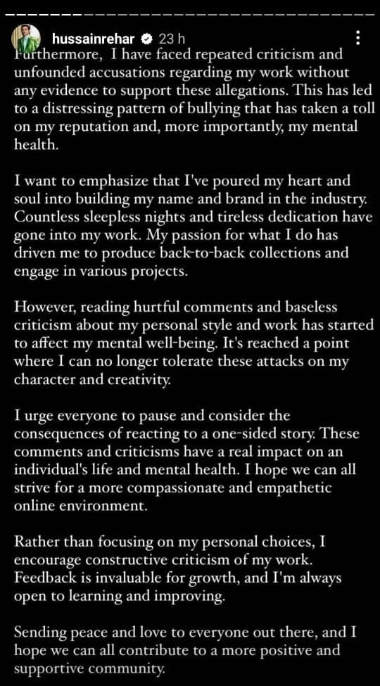 Fashion designer Hussain Rehar has responded to allegations of plagiarism by Instagram art page Kook Studio, who alleged that the fashion designer stole their art pieces without giving credit. In a lengthy Instagram statement, the fashion designer wrote that his recent collection ‘Jugnu’ did not draw inspiration from any specific individual’s work.