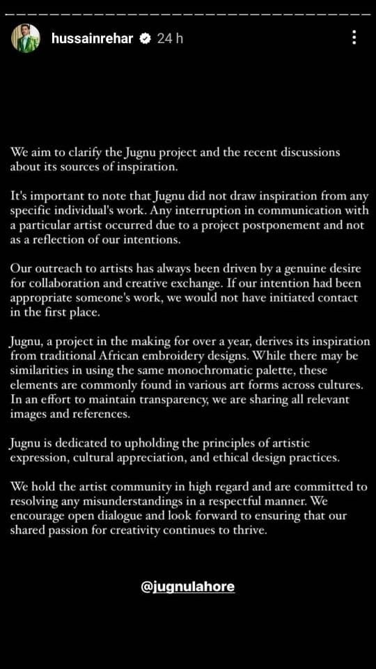 “Jugnu, a project in the making for over a year, derives its inspirations from traditional African embroidery designs. While there may be similarities in using the same monochrome palette, these elements are commonly found in various art forms across cultures. In an effort to maintain transparency, we are sharing all relevant images and references.”