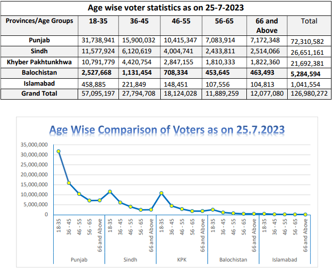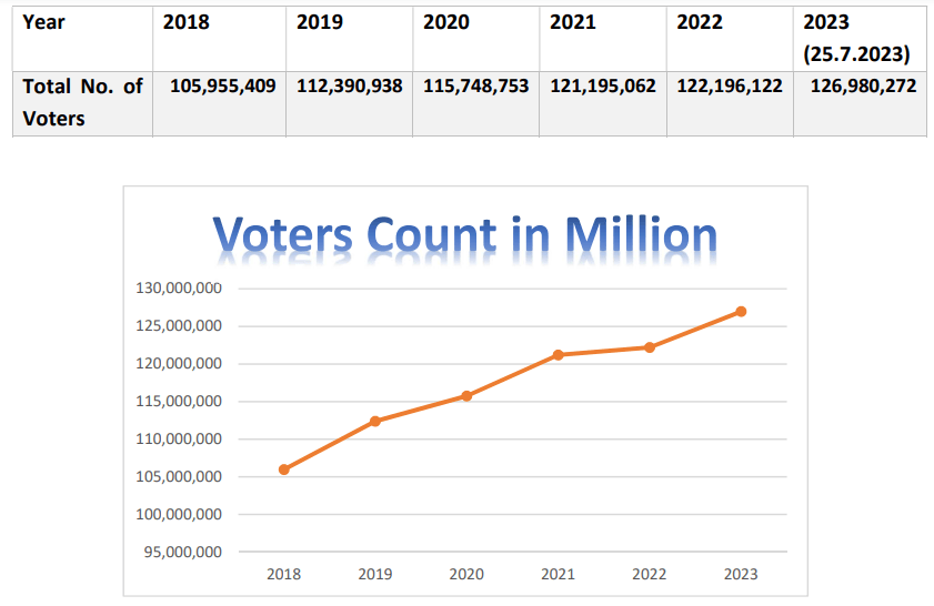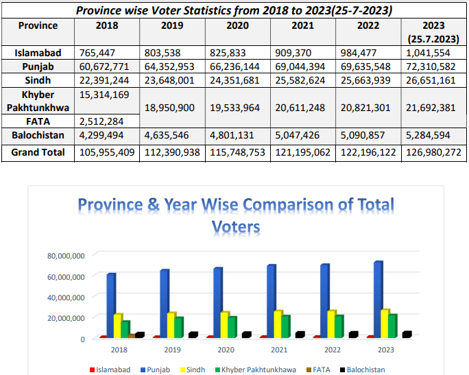 The Election Commission of Pakistan (ECP) has said that the total number of voters has reached 126,980,272, while the total number of voters in the country in the 2018 general elections was 105,955,409.