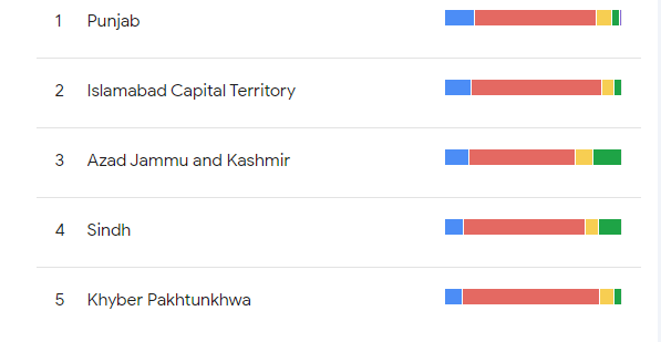 In Punjab, the most popular choices for Chief Ministership, Hamza Shehbaz, and Maryam Nawaz contrary to popular perception, are not being searched so much. After Khan winning with more than 69 percent of searches, Nawaz Sharif is at 17 percent while Maryam is at nine percent. It appears that people in Punjab are comparatively more interested in Bilawal than Hamza who has 1 percent searches from all over the province.