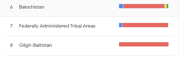 Interestingly, in the former federally administered tribal areas, only Imran Khan and Nawaz Sharif were searched for, Khan at 93 per cent of searches and Nawaz at seven percent.