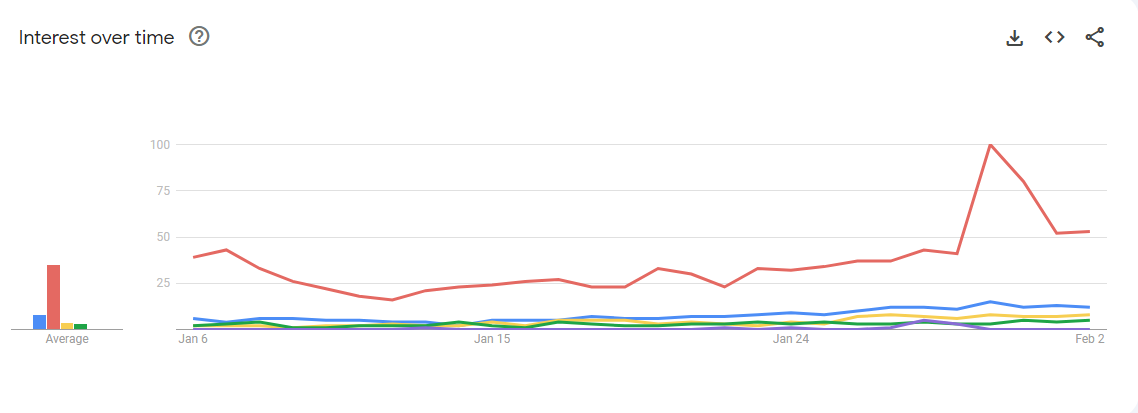 The highest and ever-increasing line graph is Imran Khan’s. The highest peak was shown on January 30 with Khan hitting the record 100 score whereas his contemporaries, Nawaz stood on 15, Maryam Nawaz at eight, Bilawal-Bhutto Zardari at three, and Hamza Shehbaz being the lowest: less than one.