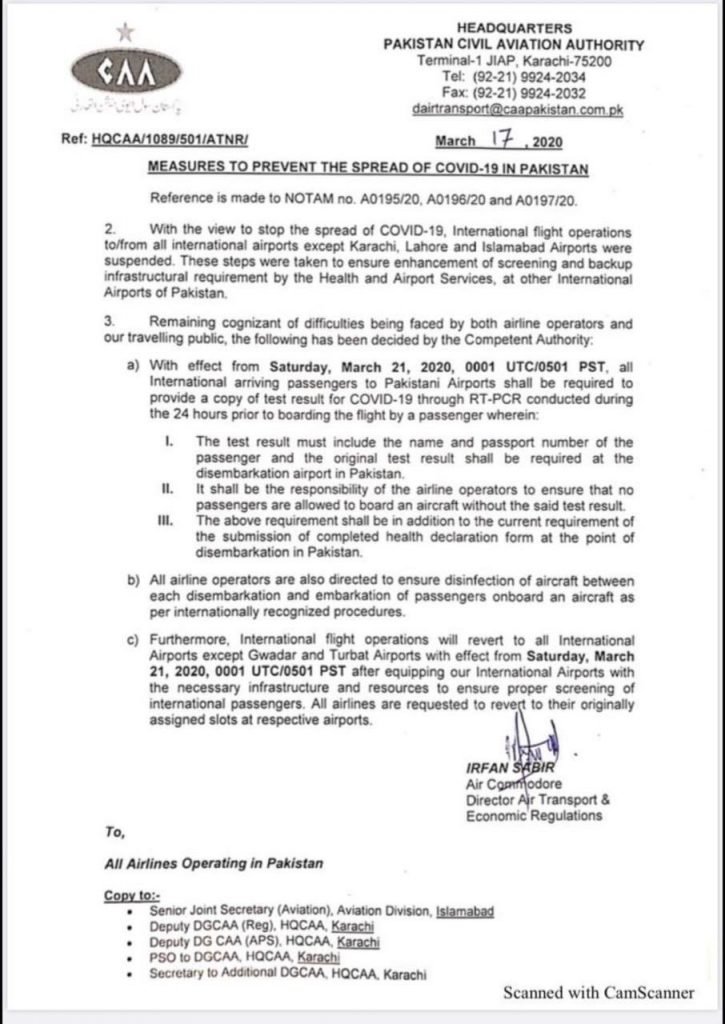 Pakistan Civil Aviation Authority (CAA) issued a notification on Tuesday saying that in order to prevent the spread of coronavirus in Pakistan, all international flight operations to/from all international airports were suspended except Karachi, Lahore and Islamabad Airports.