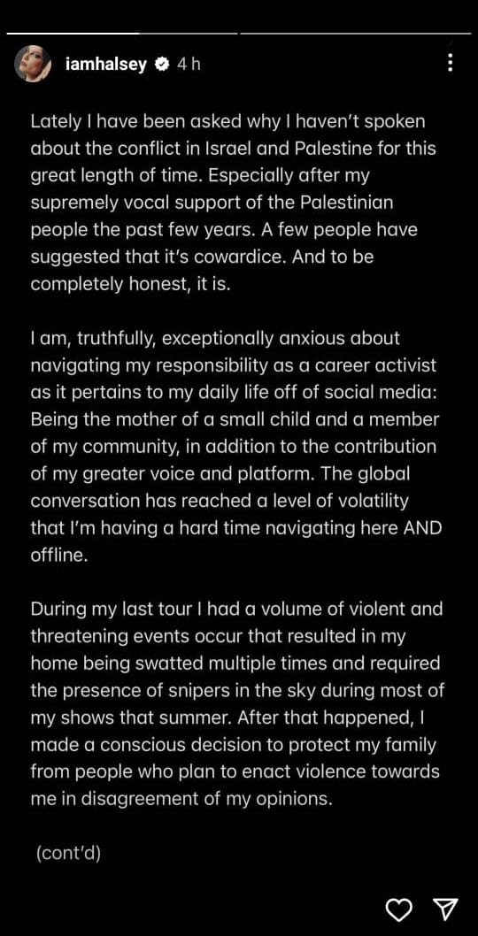 Continuing in the next slide, Halsey added that it didn’t feel right, her silence on the Palestinian genocide is keeping her from speaking out about families enduring violence in Gaza.