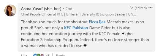 Asma Yusuf, KFC Pakistan’s Cheif People Officer (CPO), commented, “Thank you so much for the shoutout Fizza Ijaz Meerab makes us so proud! She’s not only a KFC Pakistan Dame Rider but is also continuing her education journey with the KFC Female Higher Education Scholarship Program. Indeed, there’s no force stronger than a woman who has decided to rise.”