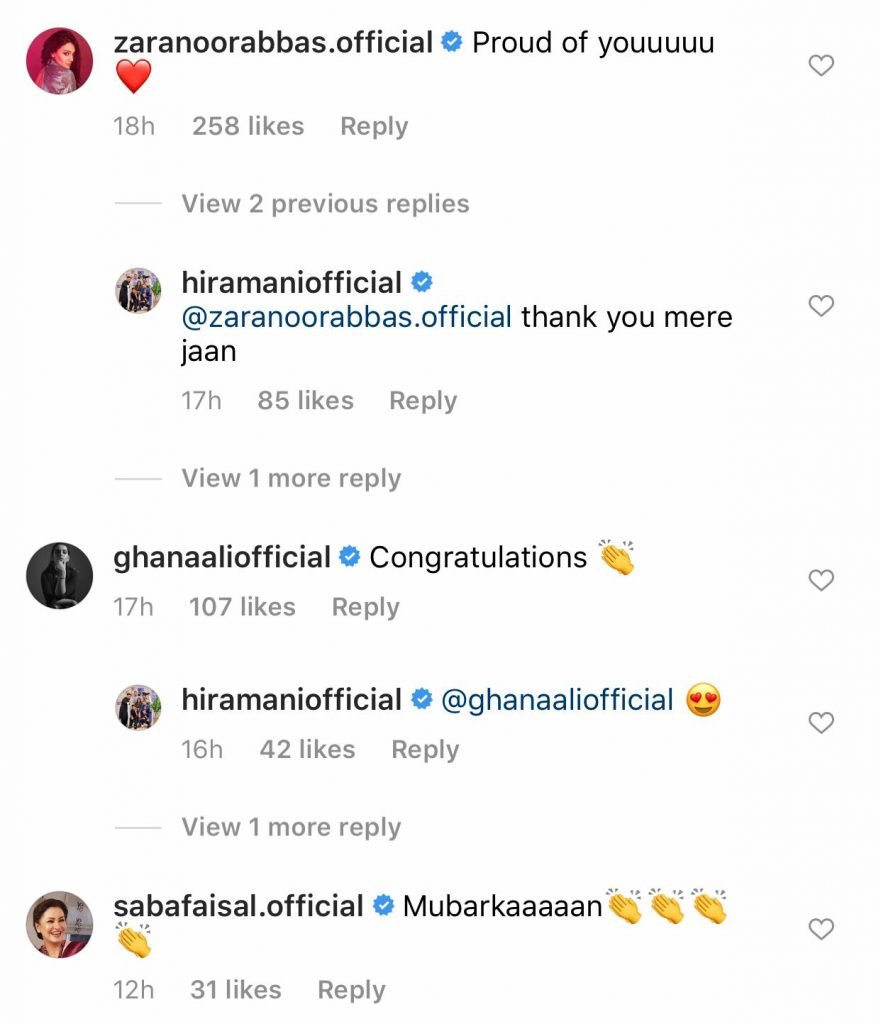 Several celebrities and her colleagues expressed their grievances on his demise. From Mahira Khan, Ghana Ali, Nida Yasir to Anoushay Abbasi all of them commented under the post to console Hira.