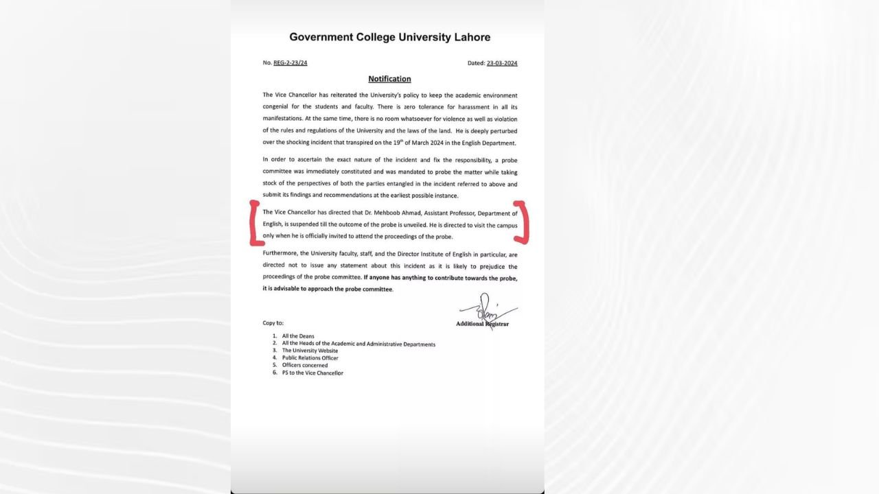 In a notification issued by the Vice Chancellor of Government College University, it has been said that till the investigation of the incident, Assistant Professor Dr. Mehboob will only be able to come to the college in connection with his case. “The Vice Chancellor has directed Dr Mehboob is suspended till the outcome of the probe is unveiled. He is directed to visit the campus only when he is officially invited to attend the proceedings of the probe,” the notification stated.